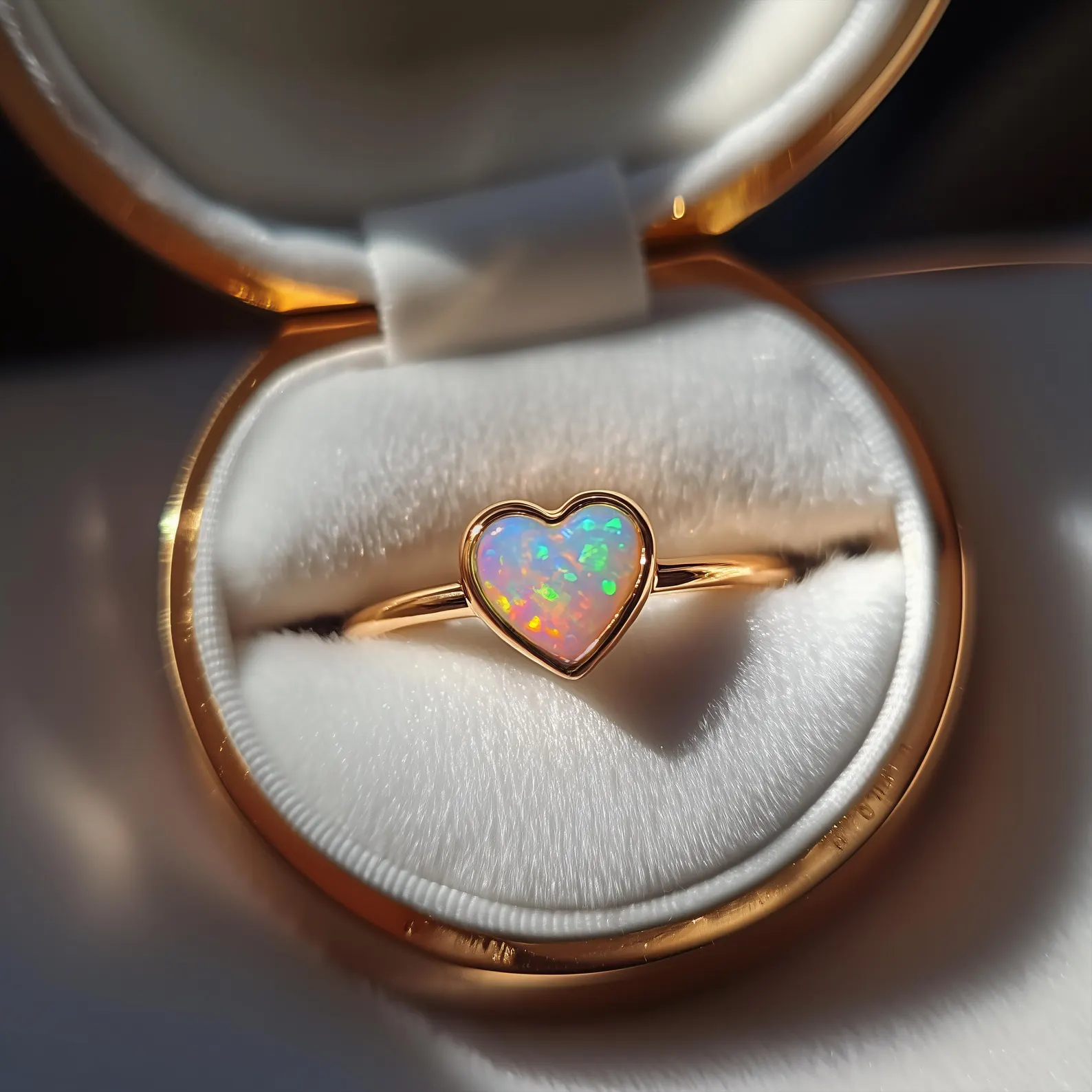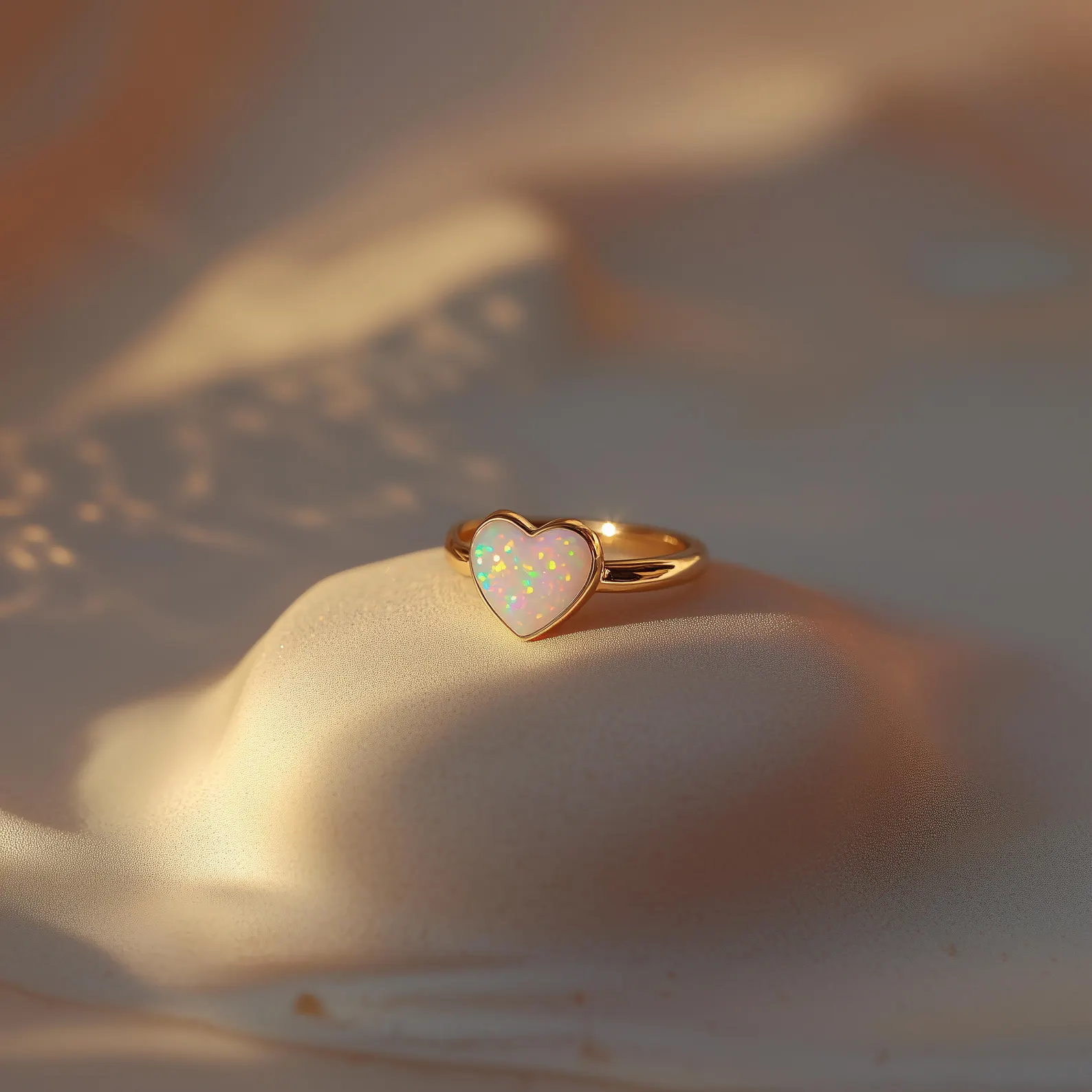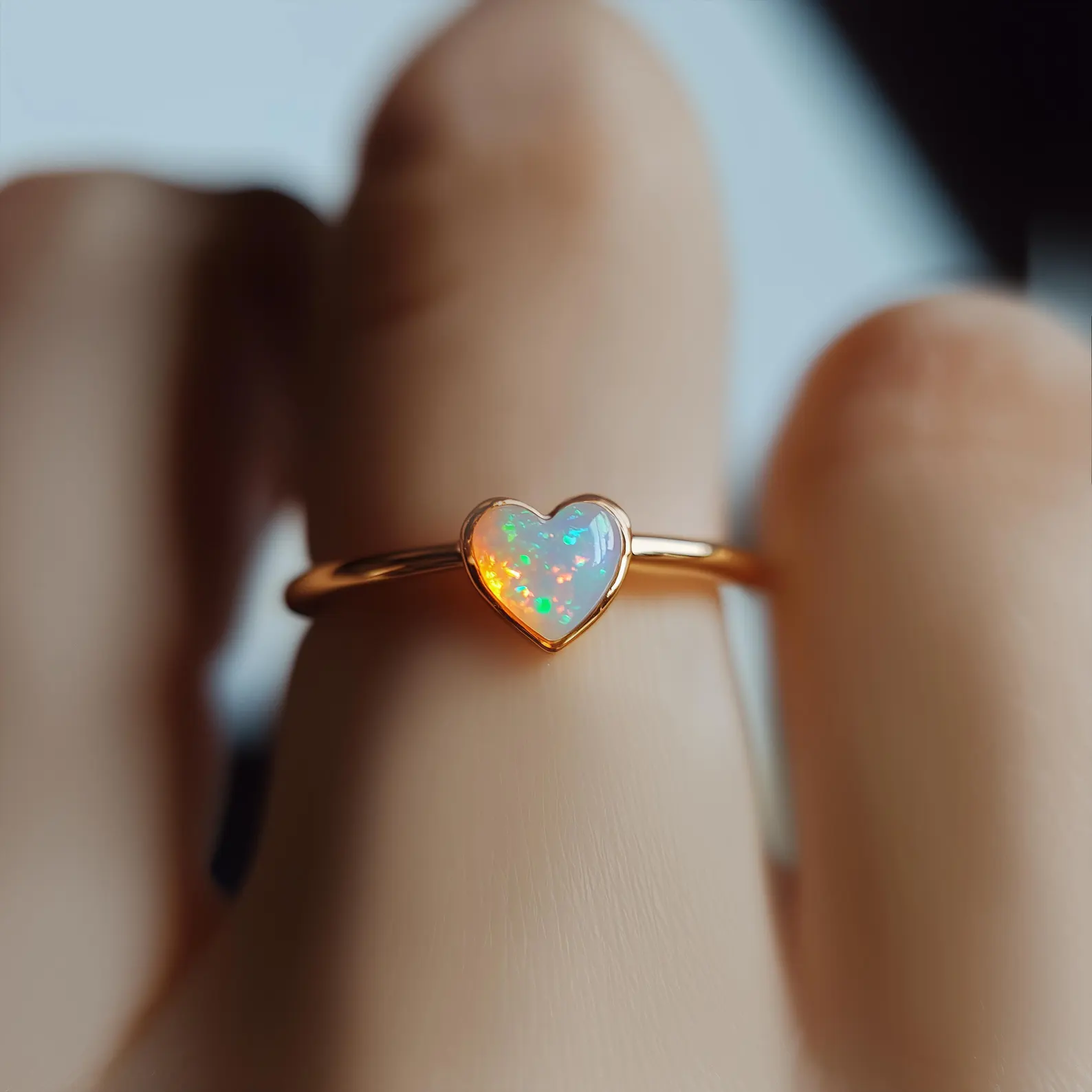A heart-shaped opal ring on a smooth, slender band — finished in 18K gold. Sweet, simple, and quietly radiant, made to be a gift for someone special, or a soft reminder to love yourself first.
