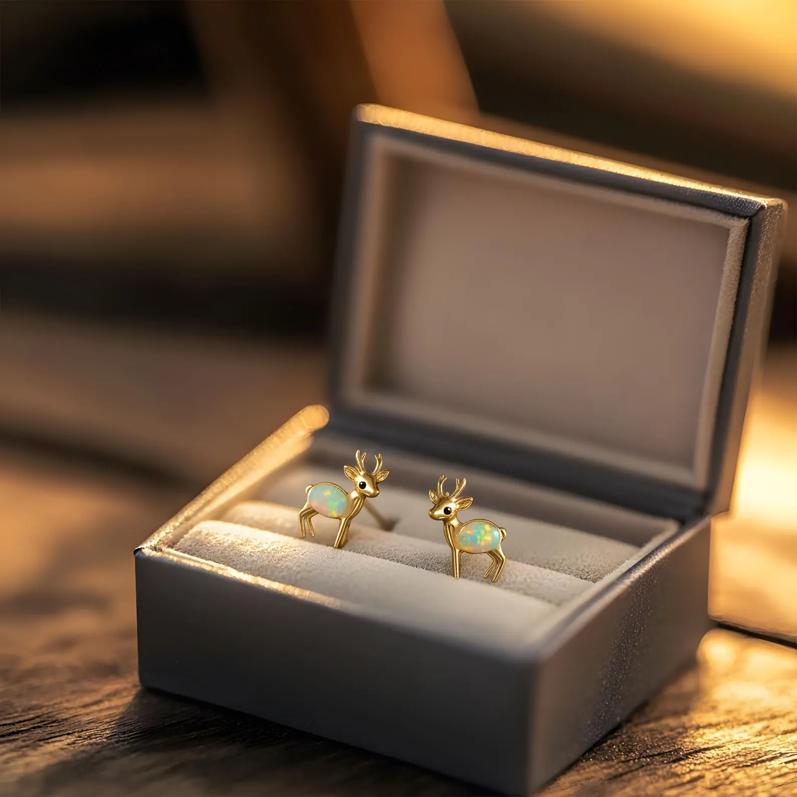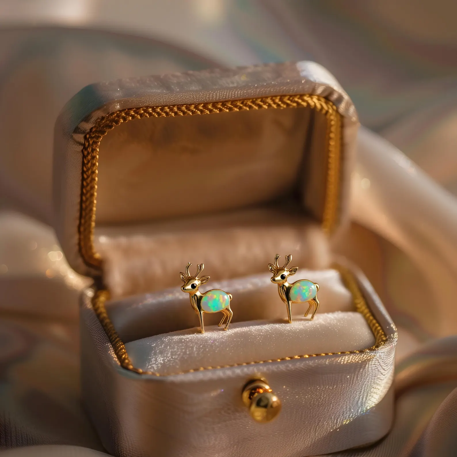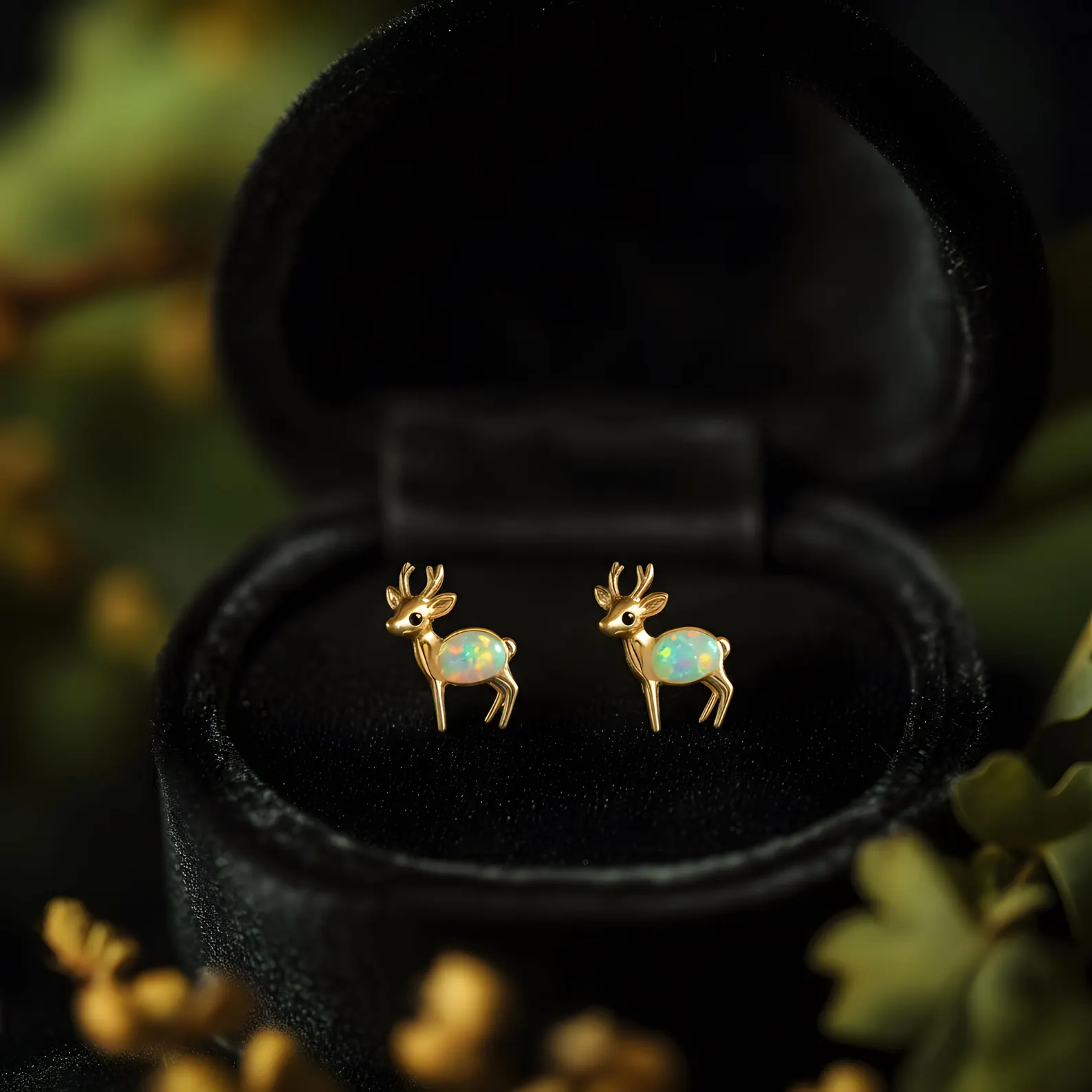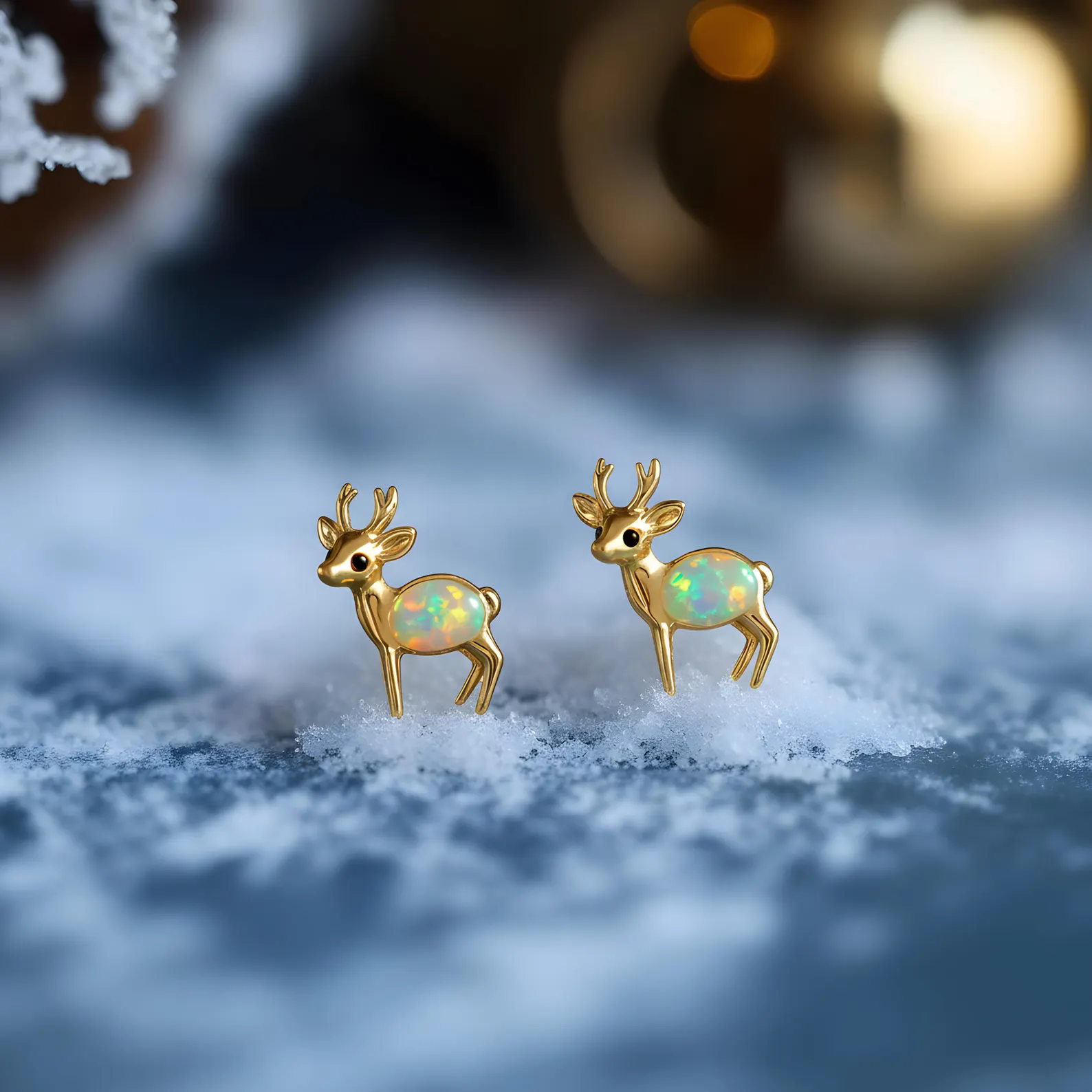 Tiny deer with iridescent opal bodies, hand-set in 925 sterling silver and finished in 18K gold. A piece of stillness — soft as snowfall, designed to be worn through every season.