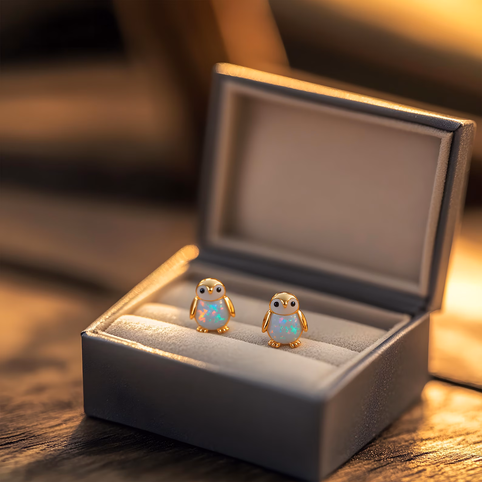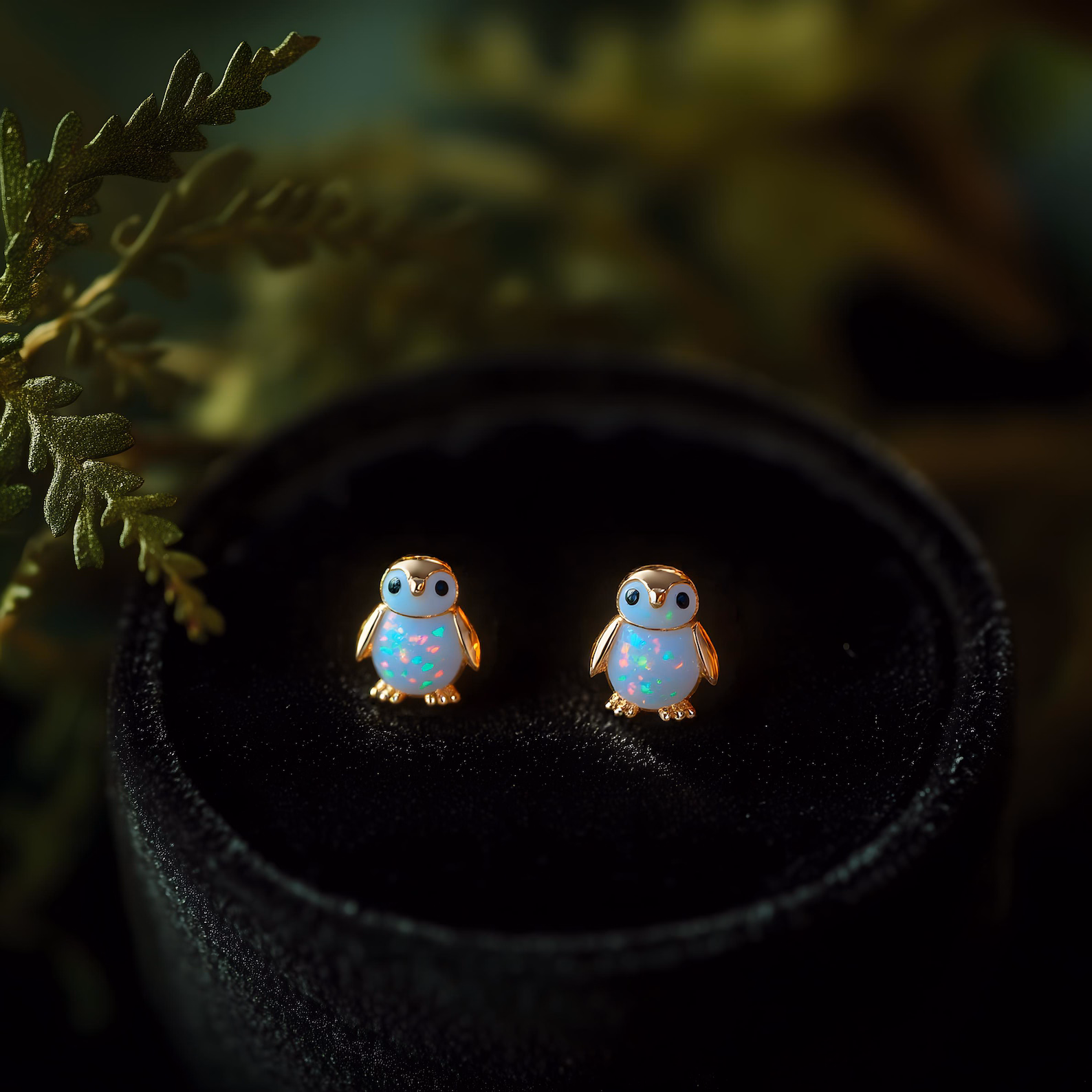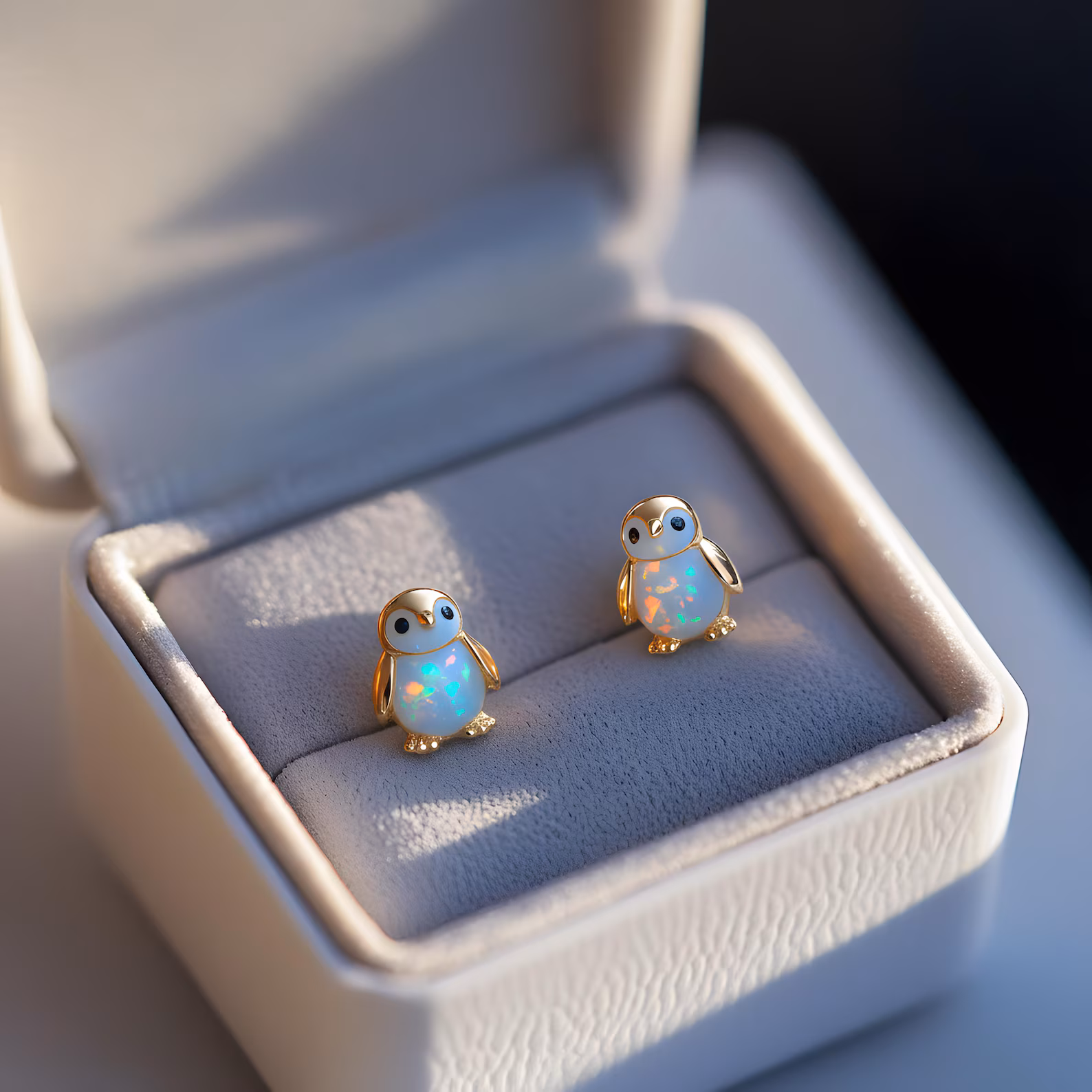 Little opal penguins with iridescent bellies, hand-set in 925 sterling silver and finished in 18K gold. Playful, delicate, and quietly luminous — a soft piece of winter to keep close, all year long.