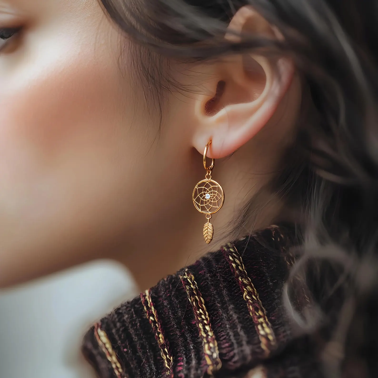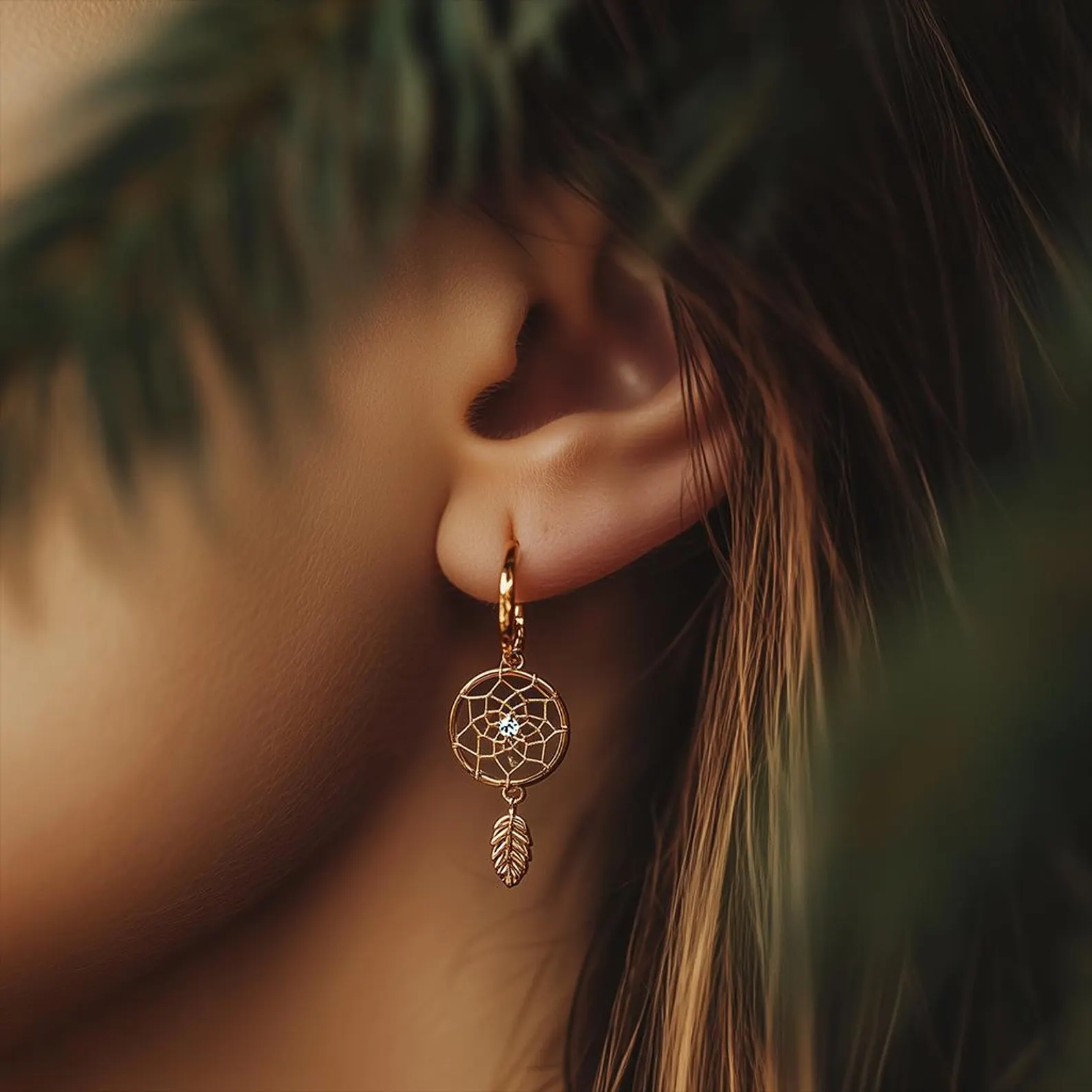 Tiny gold dreamcatcher drops with a delicate woven web, a single sparkling stone, and a feather charm — finished in 18K gold. Quietly poetic, made to move with you through the slow hours of the night.