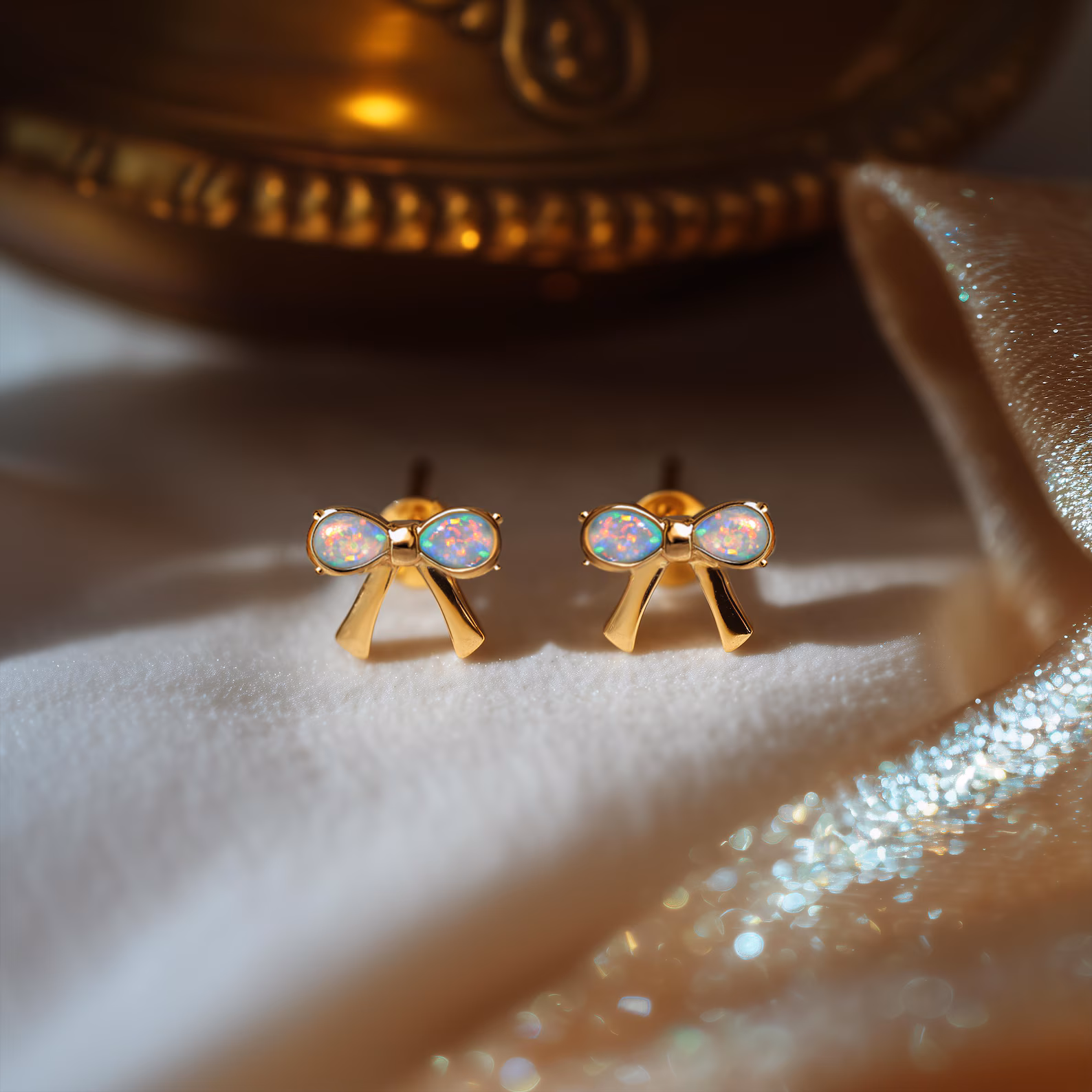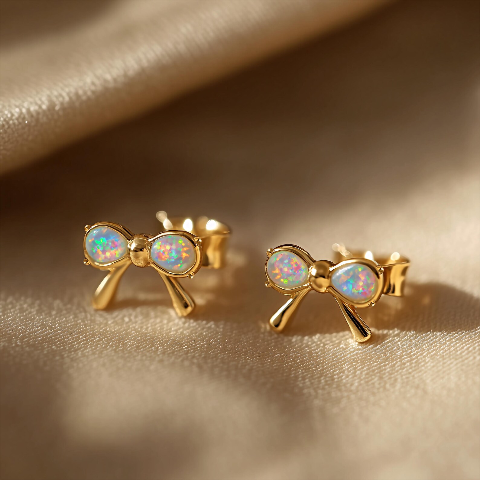 Tiny opal bows, hand-set in 925 sterling silver and finished in 18K gold. A playful twist on everyday sparkle — sweet, iridescent, and quietly charming. The kind of piece you'll reach for again and again.